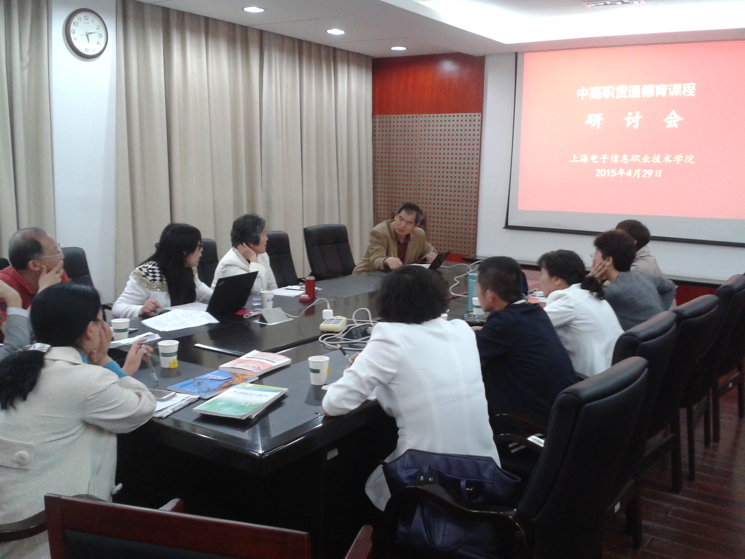 2015年4月29日下午, 中高职贯通德育课程研讨会在徐汇校区召开,会议邀请了上海市中职德育研究会秦德英老师和上海市教委教研室关月梅研究员两位专家,还邀请了上海材料工程学校、上海市经济管理学校、上海市南湖职业学校和上海市工业技术学校的相关领导和老师,上海电子工业学校副主任田皖梅也参加了会议。