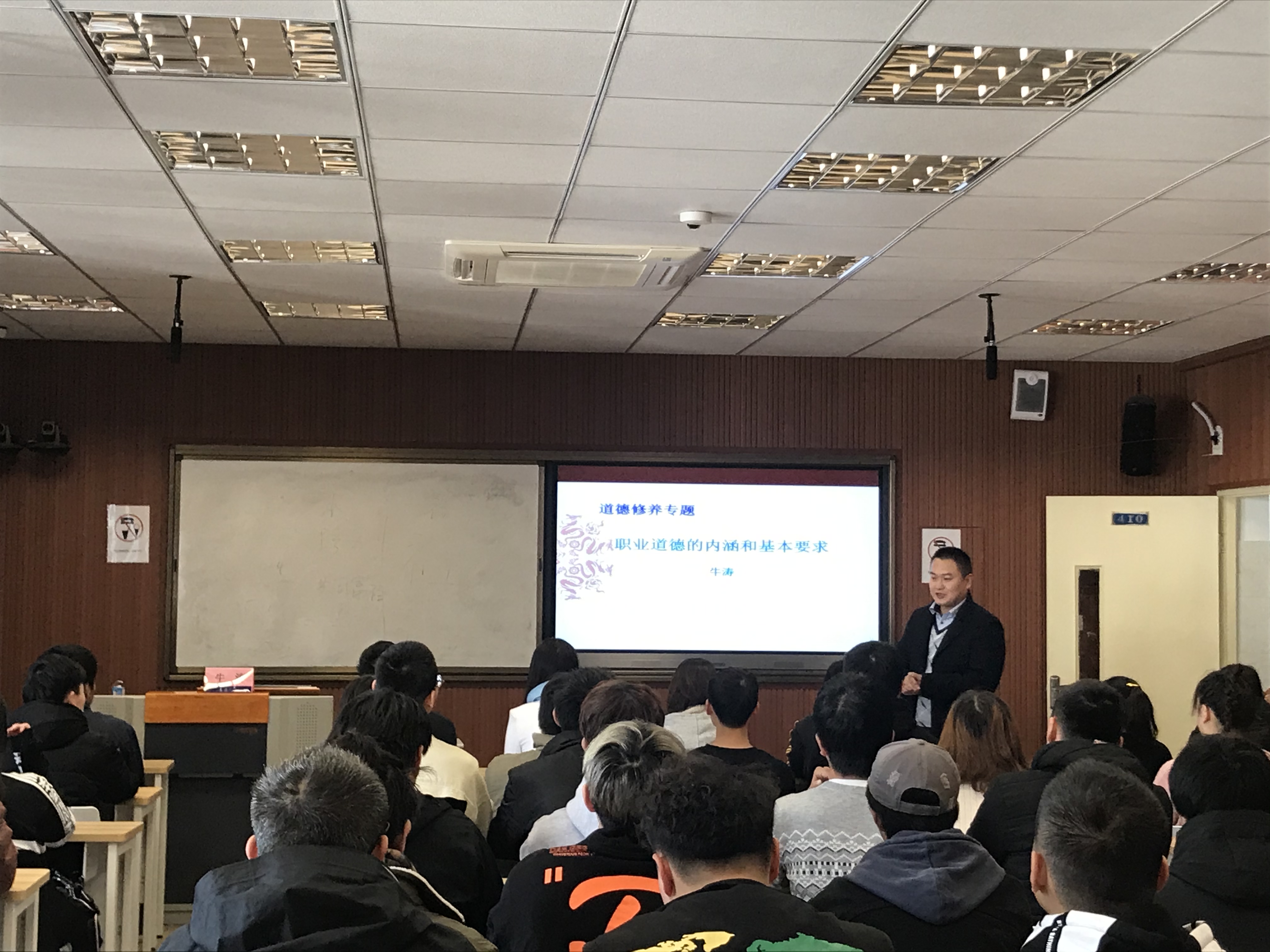 牛涛老师以“职业道德的内涵和基本要求”为题,从网上流行的“钓鱼执法”视频导入,并通过“发现假钱怎么办?“ “如何评价范跑跑行为?”等熟知的案例,阐述了职业道德的概念、特点和范畴等。并且通过自身的职业经历,教育学生明确当前的就业现状,分析自身各项素质,最后做到量身定做,即有意识的培养自身相关素质,只有这样毕业后顺利就业才会成为可能。并且希望学生能够乐业、敬业、勤业。
