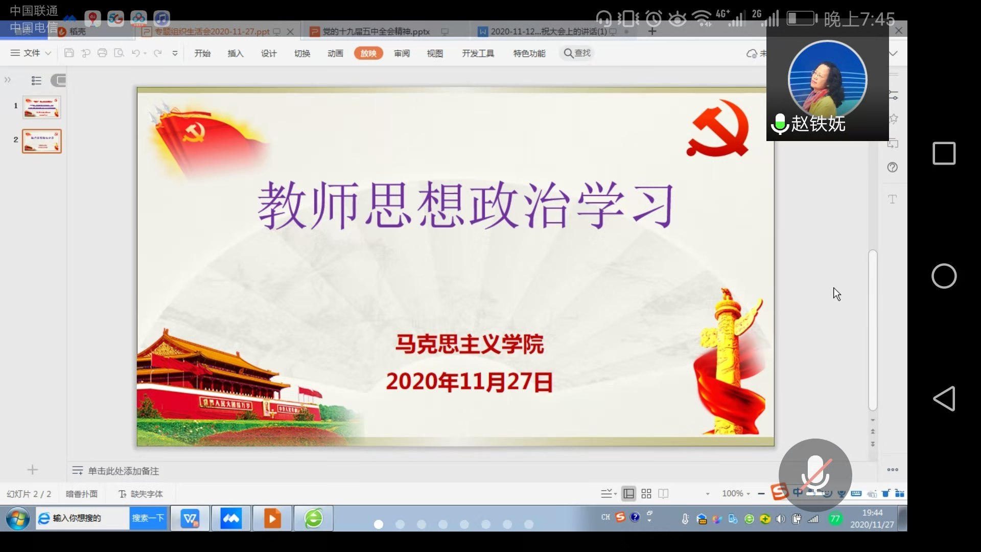 2020年11月27日,马克思主义学院通过腾讯会议平台开展了11月的教师思政学习,本次学习由思想道德修养与法律基础教研部主任赵铁妩老师领学,马克思主义学院全体教师参加了学习。