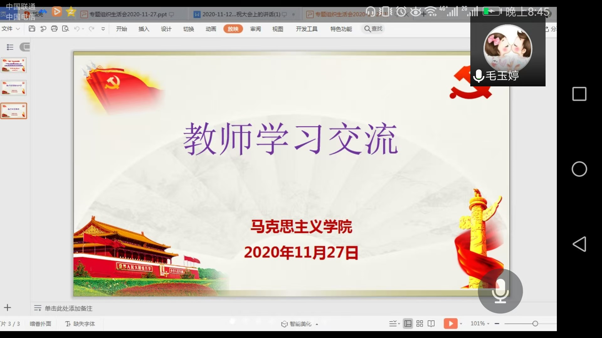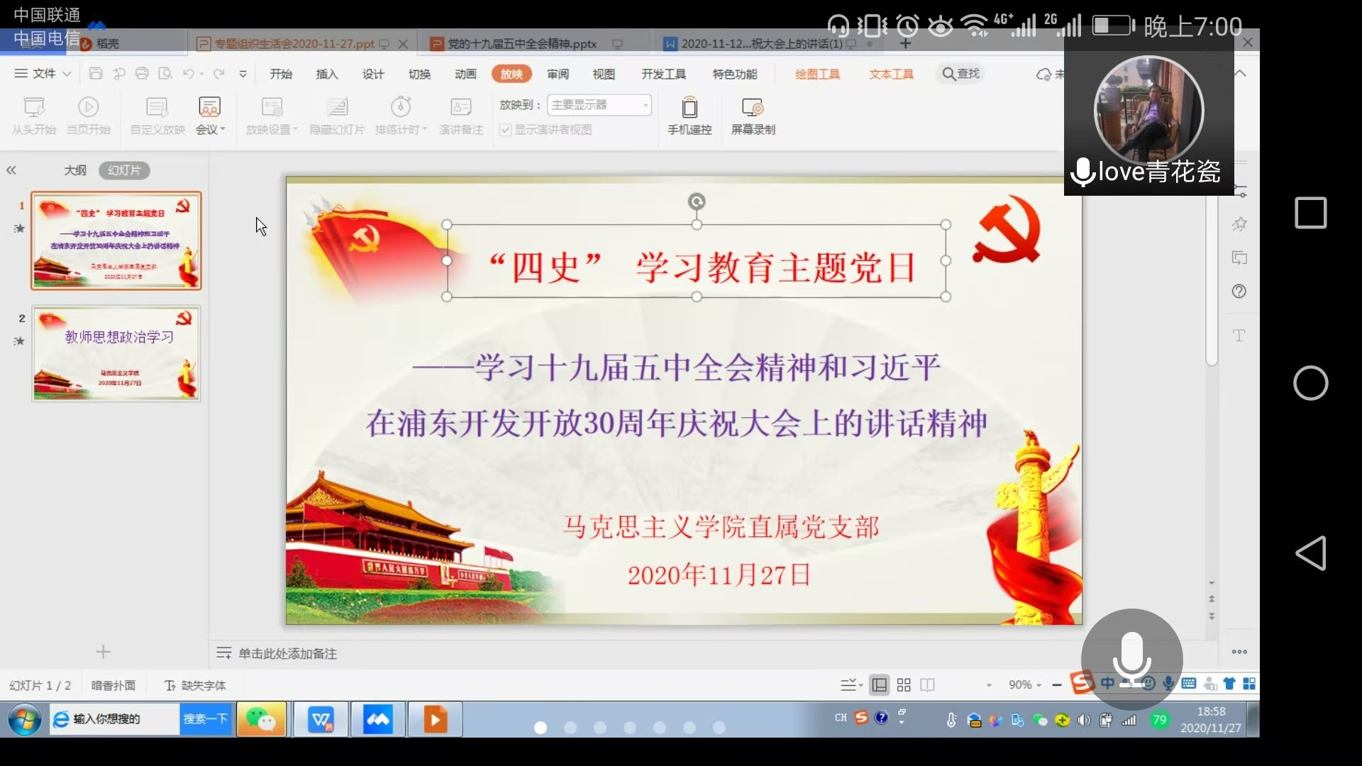 为深入学习十九届五中全会精神和习近平在浦东开发开放30周年庆祝大会的讲话精神,根据学校党委关于“四史”学习教育的工作部署,11月27日,马克思主义学院直属党支部通过腾讯会议平台开展了“四史”学习教育主题党日活动。活动由党支部副书记江龙主持,学校党委副书记、纪委书记毛玉婷以及马院全体党员教师参加了本次活动。