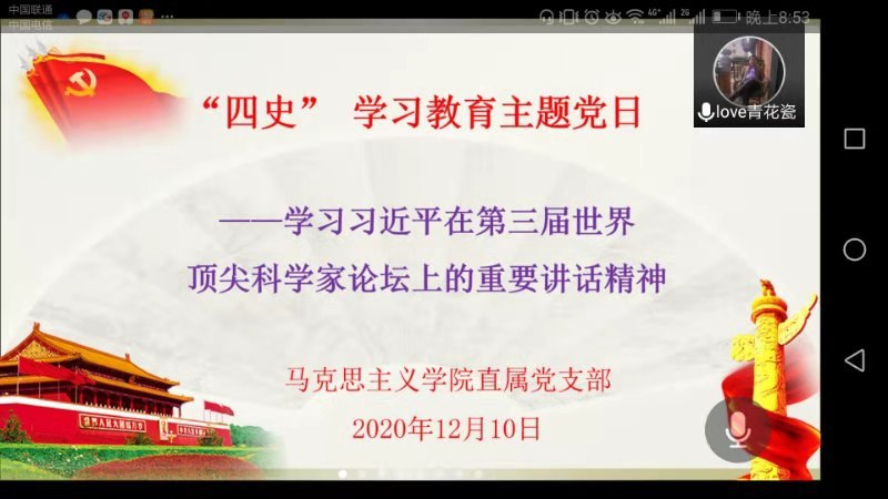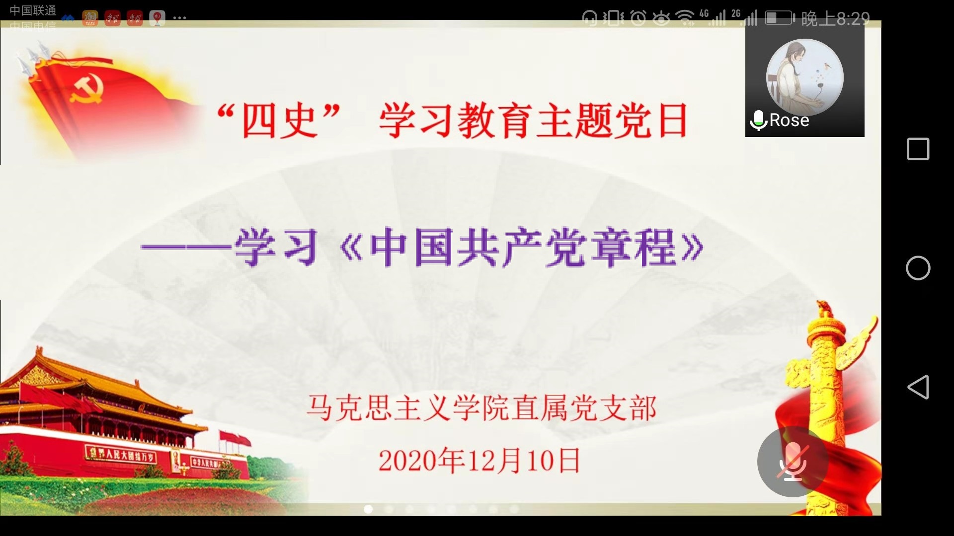 为深入贯彻落实学校“四史”学习教育,根据学校组织部工作提示,12月10日,马克思主义学院直属党支部通过腾讯会议平台开展了学习党章和习近平重要讲话精神主题党日活动。活动由直属党支部副书记江龙主持,学校党委副书记、纪委书记毛玉婷以及马院全体党员教师参加了本次活动。