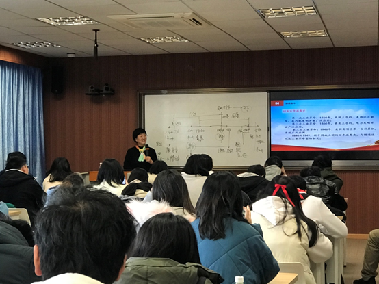2020年12月14日上午,气温骤降,寒意逼人,H310教室却秩序井然,温暖如春。学校党委副书记、纪委书记毛玉婷正在给191环艺1班和191数媒艺术1班的同学上形势与政策课,这次课程的主题是《历史方位 百年成就 百年目标——十九届五中全会精神学习》。