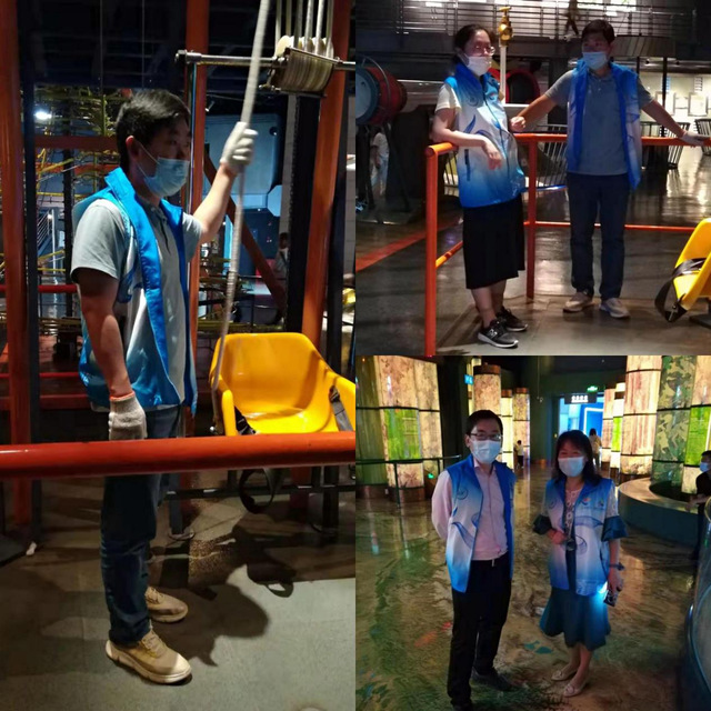 参加本次活动的党员教师两两组合,分散在展区的“一园三区”,主要工作是维持展区秩序、引导客流、讲解项目操作方法和保持展区清洁卫生。在经过简单培训后,大家很快地熟悉项目要求和工作流程,投入到紧张有序的工作中。宋立峰老师和朱佳老师服务的项目是“滑轮组提升”,由于小朋友力气小,需要工作人员拉动绳索帮助他们上升和下降,这是纯粹的体力活儿,两位老师工作起来认认真真、一丝不苟。“越转越快”,转到最后头会晕,负责该项目的杨旭老师每次都贴心地提醒体验者“慢一点、别急着站起来”。“高空骑车”对身高和体重是有要求的,有些小朋友却“强行闯关”,每次都被范人伟老师眼疾手快地拽回来。这样认真服务的老师还很多,遂以诗记之: