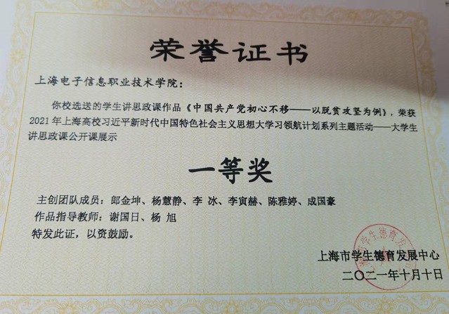 通知下发后,我校理论学习社团“文思木铎”党史宣讲团成员郎金坤、杨慧静、李寅赫、李冰、陈雅婷、成国豪等积极报名参赛,他们在马克思主义学院思政课教师谢国日、杨旭等指导下组建团队,围绕形势与政策课程中的有关章节选择了三个专题进行教学设计,经过撰写教案、制作课件、试讲演练多次打磨,参赛团队选择了《中国共产党初心不移——以脱贫攻坚为例》为参赛作品,顺利进入复赛。备赛过程中,马克思主义学院副院长茌良计、党支部副书记江龙和办公室主任王雪玲老师等进行了多次指导,提出了宝贵的意见。7月3日,参赛团队前往上海市教科院进行了终审决赛,我校学生与来自复旦大学、上海交通大学、同济大学等18所高校进入复赛的参赛团队同台竞技,最终荣获一等奖。