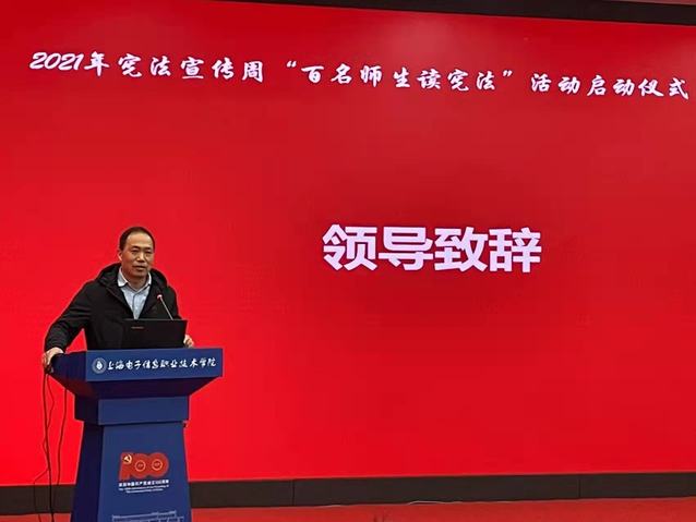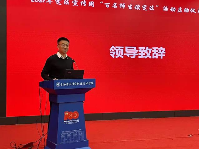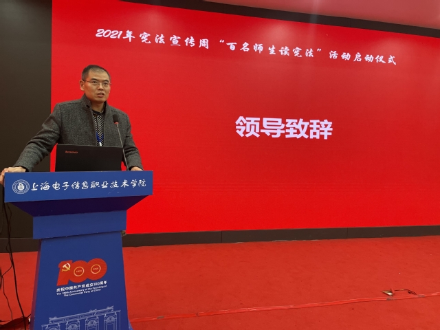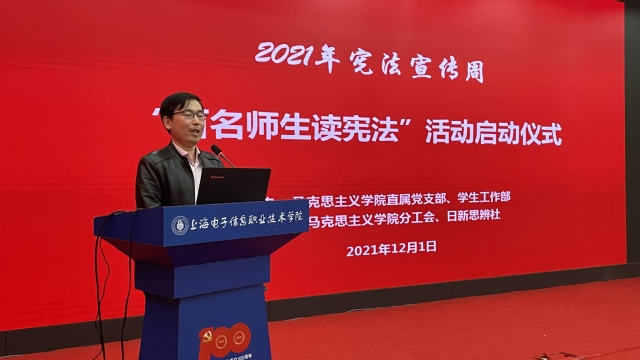 在启动仪式上,马克思主义学院副院长茌良计宣布活动正式启动;马克思主义学院直属党支部副书记江龙结合马院实际,对2021年全国“宪法宣传周”的主题“以习近平法治思想为指引,坚定不移走中国特色社会主义法治道路”进行了解读;学生工作部副部长栾文飞对广大学生提出不仅要读好宪法而且要宣传宪法,在学习生活中做遵守宪法的模范;日新思辨社指导老师刘蔚介绍了活动要求;参加启动仪式的教师和同学们在现场共同朗诵了部分宪法内容。马克思主义学院分工会主席刘学飞主持了启动仪式并代表本次活动组委会向全校师生发出“弘扬宪法精神,师生共读宪法”的号召。