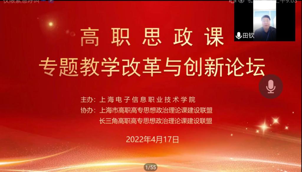为推进全国高职思政课专题教学改革与创新,4月17日,由上海电子信息职业技术学院主办,上海高职高专思政课建设联盟、长三角高职高专思政课建设联盟协办的全国高职思政课专题教学改革与创新论坛在线上召开。来自全国多个高职院校的300多名思政课教师参加了会议。会议由上海电子信息职业技术学院马克思主义学院直属党支部副书记江龙主持。