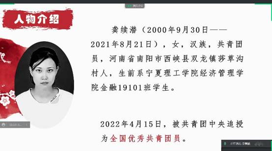 第二位宣讲者是文思木铎宣讲团的李寅赫同学,她的宣讲题目是《浑金璞玉 生如夏花》,她生动的为我们叙说了前不久被追授为“全国优秀共青团员”龚续潜的事迹。这位00后女孩2021年暑假在家休假时主动参与家乡疫情防控,除了在卡点值班,还利用自己的特长,承担起村疫情数据统计处理工作。工作中她默默无闻,吃苦耐劳,加班加点,无私奉献,为疫情防控工作做出突出贡献,用实际行动诠释了当代大学生的使命担当。但不幸的是在2021年8月21日,在疫情防控卡点值班时,不慎跌入河中,经抢救无效,献出了年仅20岁的宝贵生命。