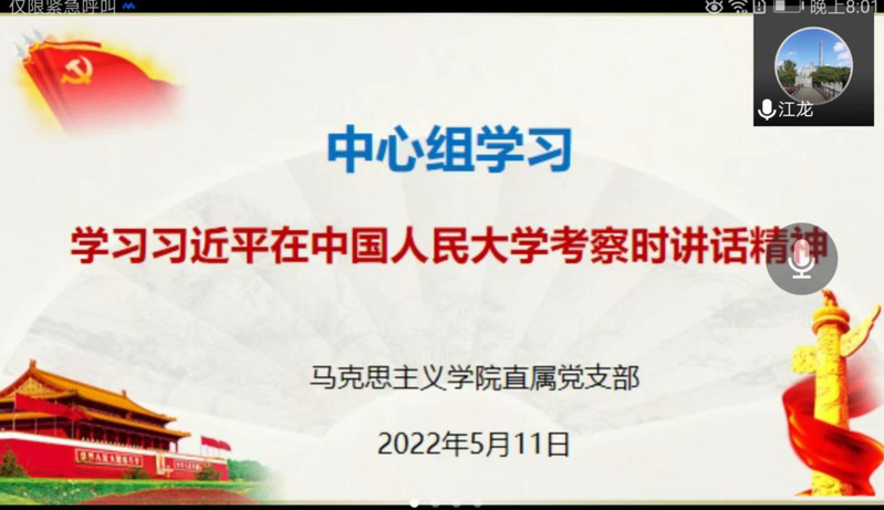 为深入学习宣传贯彻习近平总书记在中国人民大学考察调研时的重要讲话精神,根据学校工作要求,5月11日晚上,马克思主义学院直属党支部中心组通过腾讯会议平台开展学习活动,学习主题聚焦“习近平在人民大学考察时的重要讲话精神”,直属党支部副书记江龙主持了会议。