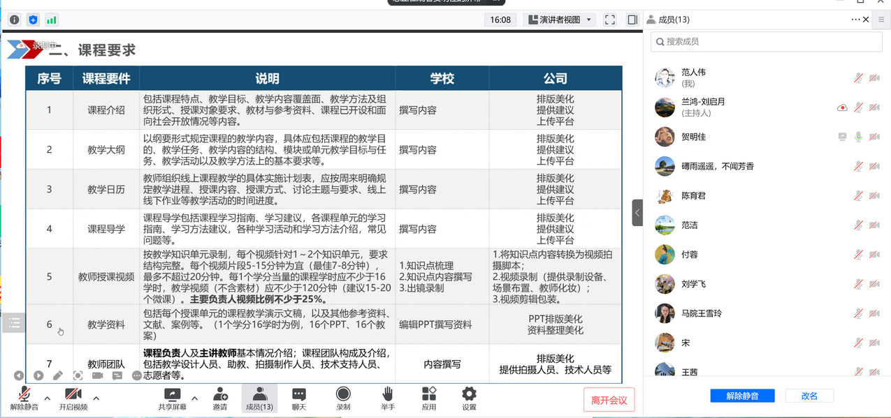为开展新一轮开放课程建设工作,7月13日下午,毛泽东思想和中国特色社会主义理论体系概论教研部(以下简称“概论教研部”)通过腾讯会议平台召开了“高职在线开放课程解决方案”线上会议。会议由概论教研部主任范人伟主持,开放课程建设团队的12位老师和上海兰鸿教育科技有限公司两位负责人参与了会议。