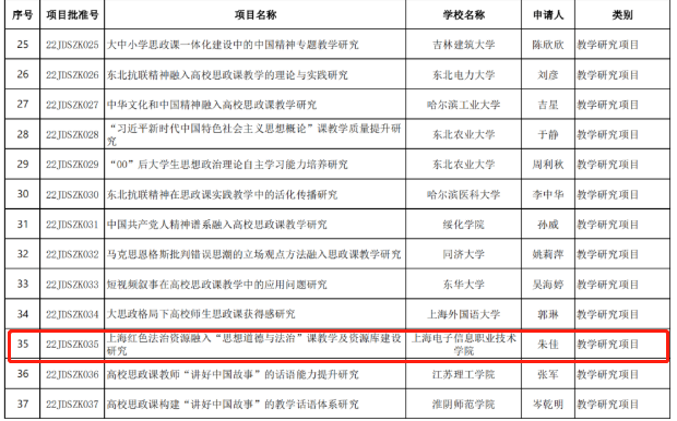 近年来,我校思政学科科研水平稳步提升。这是马克思主义学院第三次获批教育部立项课题,也是朱佳老师第二次获得同类立项课题,同时也是我校上海红色文化传承研究中心成立以来成功申报的第一个省部级课题。马克思主义学院将以此为契机,支持和鼓励更多教师申报高级别课题,努力培养一支教学水平高、科研能力强的优秀教师队伍,多出高水平的科研成果,提升我校“大思政课”建设成效,助力学校申本工作稳步推进。(供稿单位:马克思主义学院)