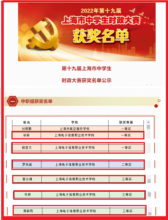 在由市教卫工作党委、市教委指导,上海市学生德育发展中心、上海教育报刊总社主办,《上海中学生报》、《当代学生》杂志、上海市中小学德研会中职专委会承办的2022年第十九届上海市中学生时政大赛决赛中,我校五年一贯制学生荣获中职组一等奖2个,二等奖1个,三等奖3个,创造了我校参加市级时政大赛有史以来最好成绩。