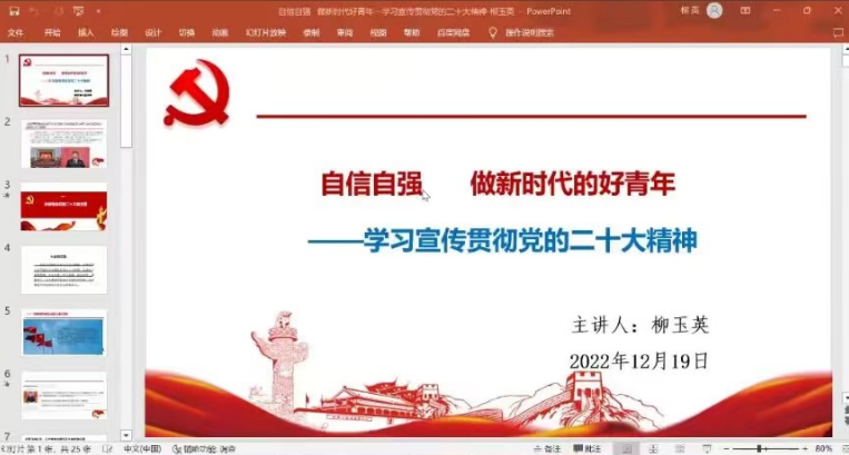 12月19日下午,柳玉英老师在22电气2班宣讲,她宣讲的主题为:《自信自强 做新时代好青年——学习贯彻党的二十大精神》。宣讲分为三个部分:首先,对党的二十大的大会主题的丰富内涵作了系统梳理和阐释,让学生理解大会主题明确宣示了我们党在新征程上举什么旗、走什么路、以什么样的精神状态、朝着什么样的目标继续前进的重大问题。其次,结合党的二十大报告关于教育科技人才战略上的重大部署,让学生明白,今天,我国职业教育已经站到了新的历史起点上,在全面建设社会主义现代化国家新征程中,职业教育前途广阔、大有可为。最后,结合二十大报告,提出做新时代好青年几点要求。