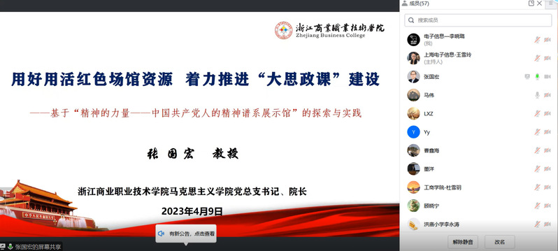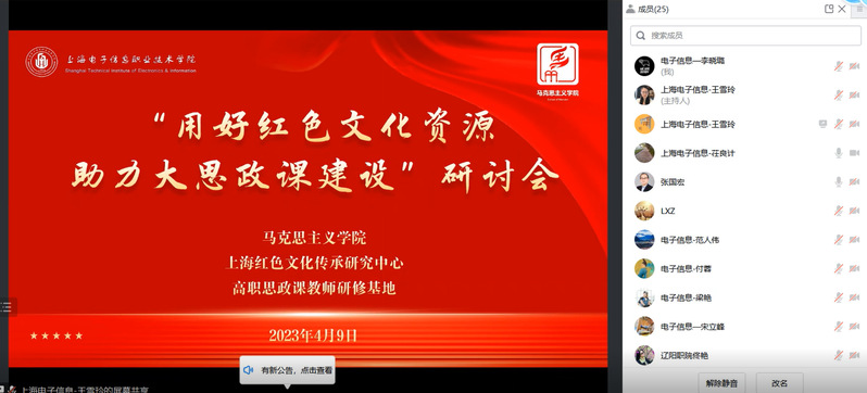 为贯彻落实教育部关于全面推进“大思政课”建设的工作方案,推进我校运用红色文化资源助力“大思政课”建设的能力和效果。4月9日上午,由我校马克思主义学院主办,上海红色文化传承研究中心、全国高职思政课教师研修基地承办的“用好红色文化资源,助力大思政课建设”研讨会在线上举行。本次研讨会邀请了浙江商业职业技术学院马克思主义学院党总支书记、院长张国宏教授主讲,会议由我校马克思主义学院副院长茌良计主持。