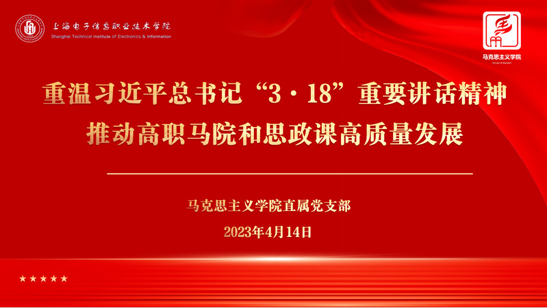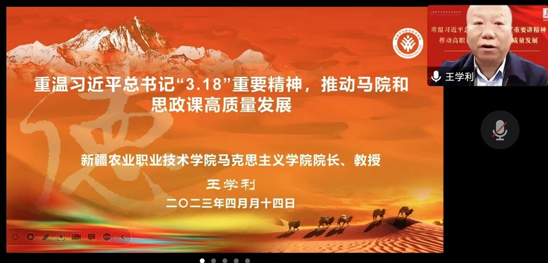 为深入学习贯彻党的二十大精神,根据上海市教育委员会德育处《关于组织开展2023年度上海高校思政课建设活动月的通知》要求, 4月14日,马克思主义学院直属党支部通过腾讯会议平台开展了“重温习近平总书记‘3.18’重要讲话精神,推动高职马院和思政课高质量发展”主题党日。活动邀请了新疆农业职业技术学院马克思主义学院院长王学利教授做专题报告,我校马克思主义学院全体党员参加了活动。
