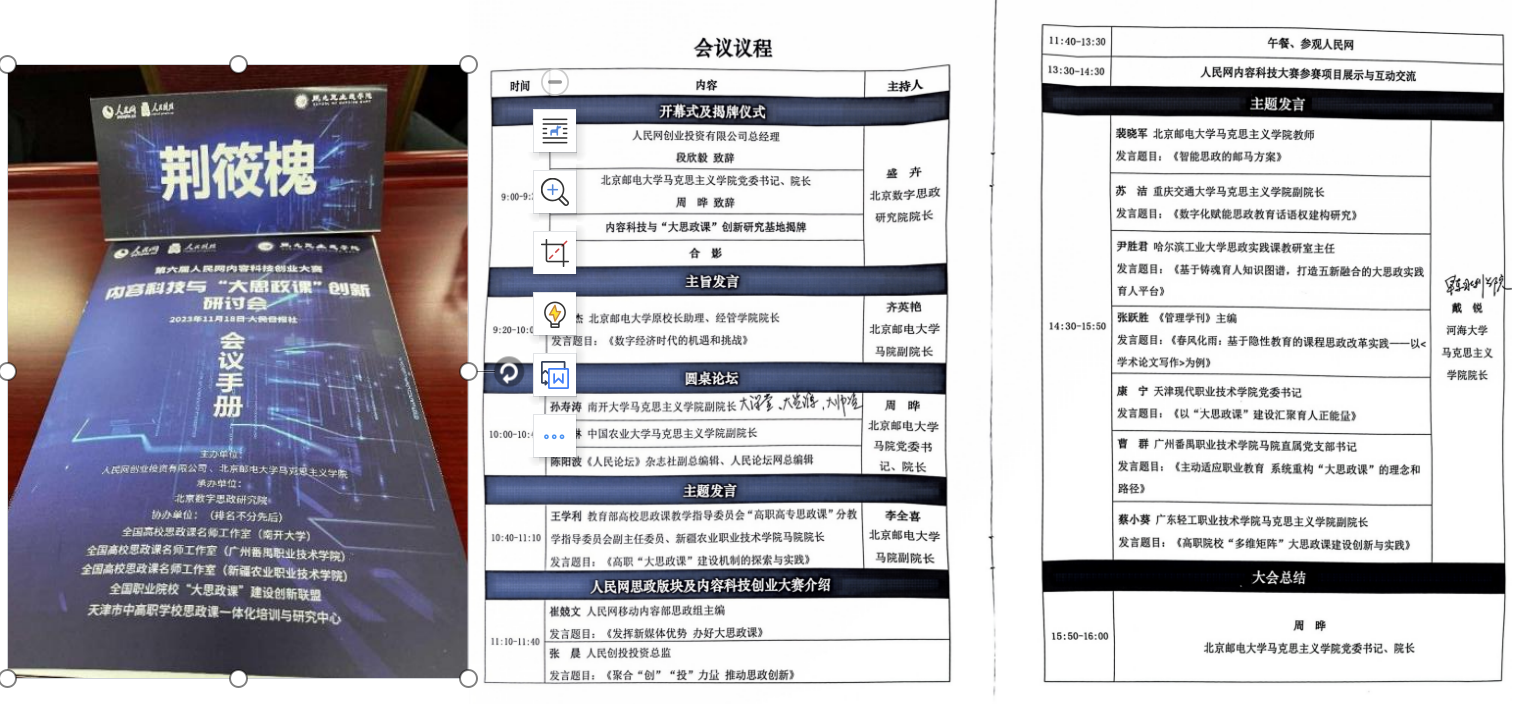 2023年11月18日,由人民网创业投资有限公司和北京邮电大学马克思主义学院主办的“内容科技与‘大思政课’创新研讨会”在人民日报社召开,我校马克思主义学院教师荆筱槐和全国部分高校思政课教师代表参加了研讨会。