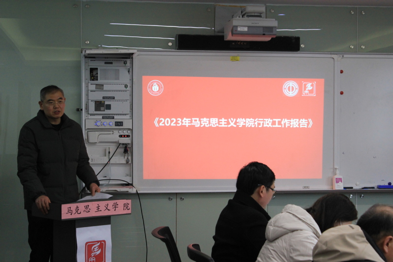 大会在庄严的国歌声中开幕。在第一次全体会议上,学院副院长茌良计向大会作了2023年马克思主义学院行政工作报告,报告全面总结了2023年马克思主义学院在教学改革任务、课程建设成效、青年教师培养、学生成长成才和科学研究及社会服务等各方面均取得了显著成绩,也反思了工作中存在的问题与不足,同时规划了2024年的工作目标与计划,鼓励全体教职工以更加饱满的热情,立足学院发展规划,继续在本职岗位上尽职尽责、守正创新,以梦为马,砥砺奋进。