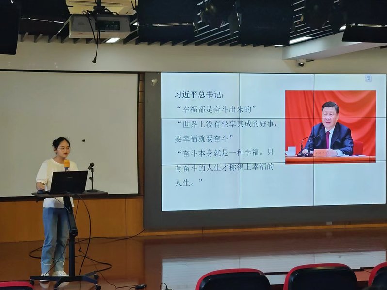 杨廷东同学以“务实求真学思想,脚踏实地长才干”为题谈了他的思考,“寂然不动,感而遂通天下之故”,他说在快节奏的现代社会中,人们往往被各种信息和诱惑所包围,难以保持内心的平静和专注,而只有当我们能够静下心来,摆脱外界的干扰和诱惑,才能真正地认识自己、了解世界,并做出正确的决策,提升自己的能力;吴艳慧同学以“幸福都是奋斗出来的”为题分享的她的观点,重点阐述了幸福与奋斗之间的紧密联系,给同学们传达了一种积极向上、努力拼搏的人生态度,鼓励大家通过自身的努力和奋斗去创造和享受幸福。
