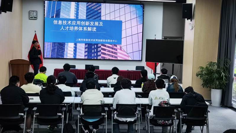 本次社会实践活动,首先由上海市信息技术应用创新综合服务中心副主任沈一忱以《信息技术应用创新发展及人才培养体系解读》为题目,为学生讲授了一堂生动的当今信创动态课程。沈主任从信创发展介绍、信创改造内容、上海市信创综合服务中心介绍和信创人才培养四个方面向学生们讲述了信创产业的发展和未来趋势。40多分钟的授课让学生们见证了性能日益强大的国产自主可控服务器系统以及服务中心的独特优势及功能和服务等方面。学生们聚精会神聆听,汲取了最前沿的信息技术动态和知识。