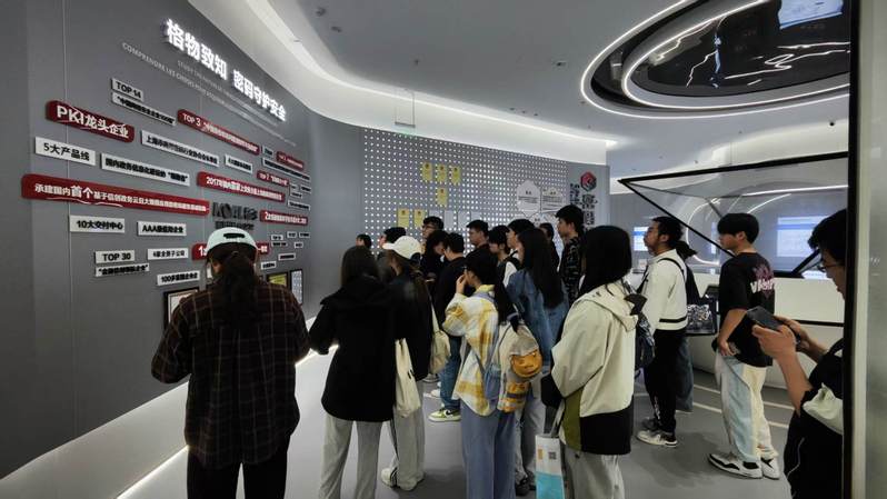 其次,教师与学生们参观了格尔软件松江基地的密码工场。讲解员带领团队参观了各行各业的密码落地场景,了解了格尔软件产品的广泛使用范围,包括上汽的智能汽车的应用、医疗、银行系统应用动态等。学生们了解了格尔软件自主可控的商业密码技术及相关知识产权,以及格尔软件公司的20年奋斗历程和产品迭代过程。